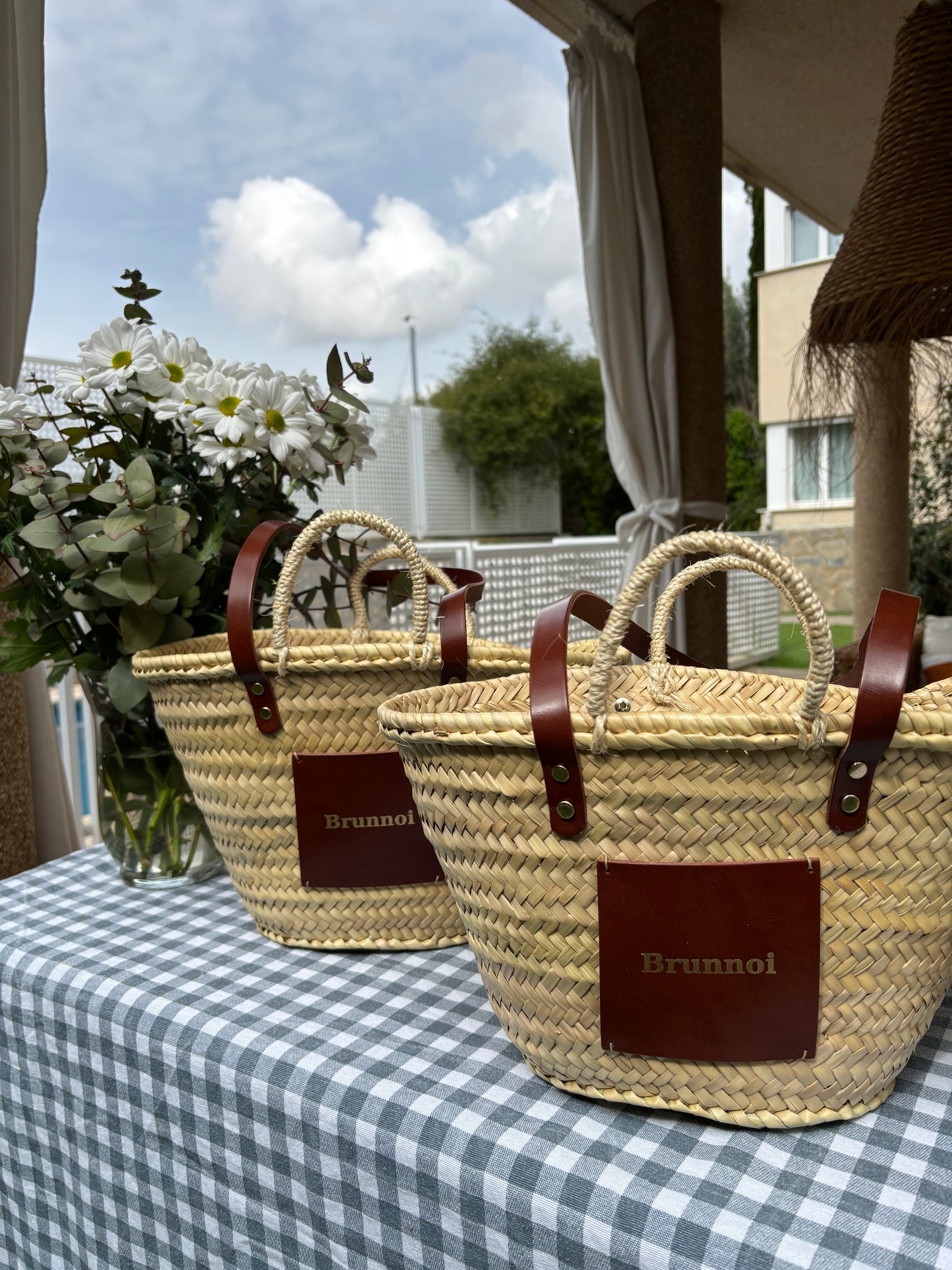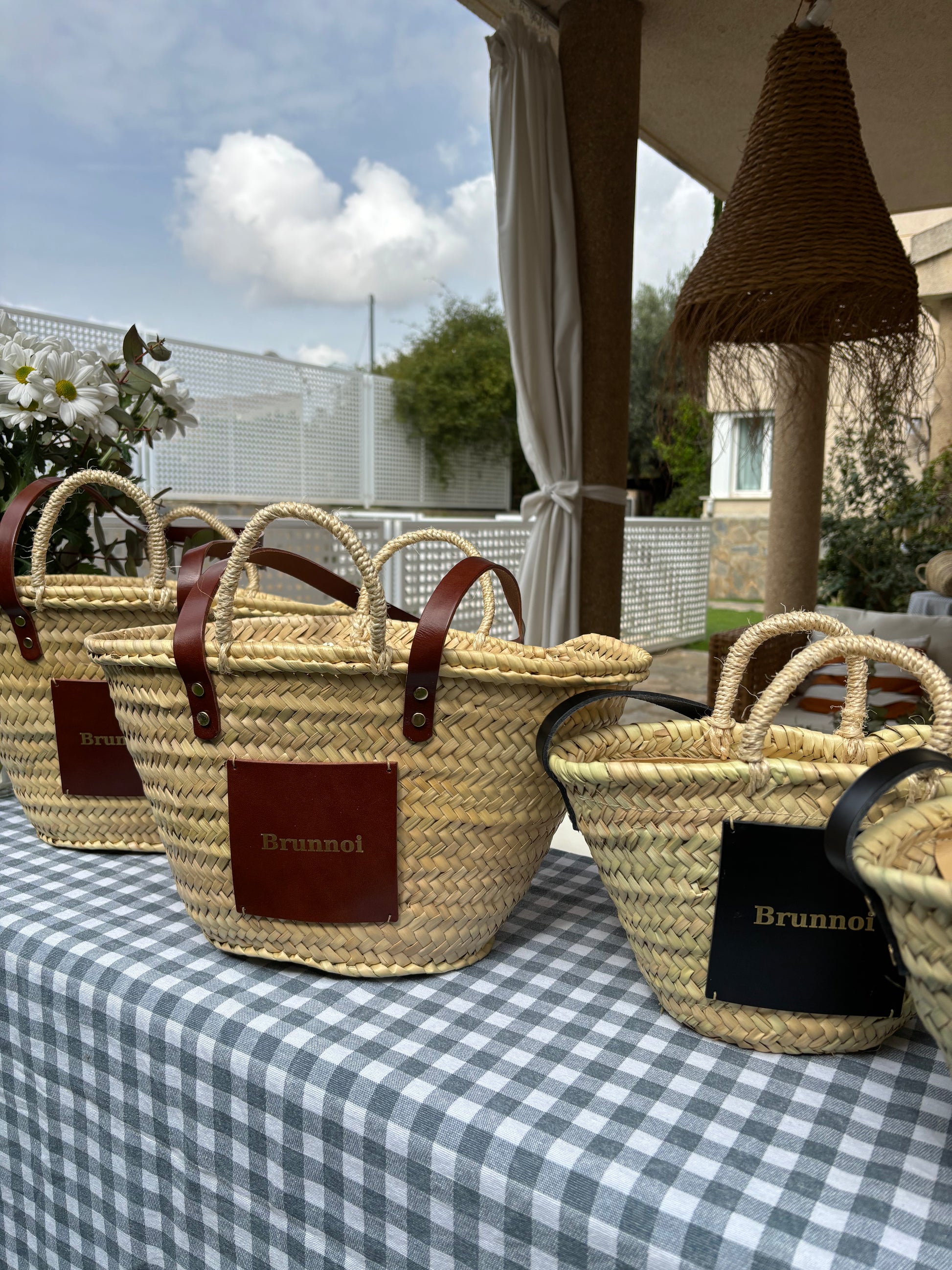 Capazo tejido a mano con palma natural y asas de hombro en piel de vaquetilla y asas de mano de pita de fibra vegetal.