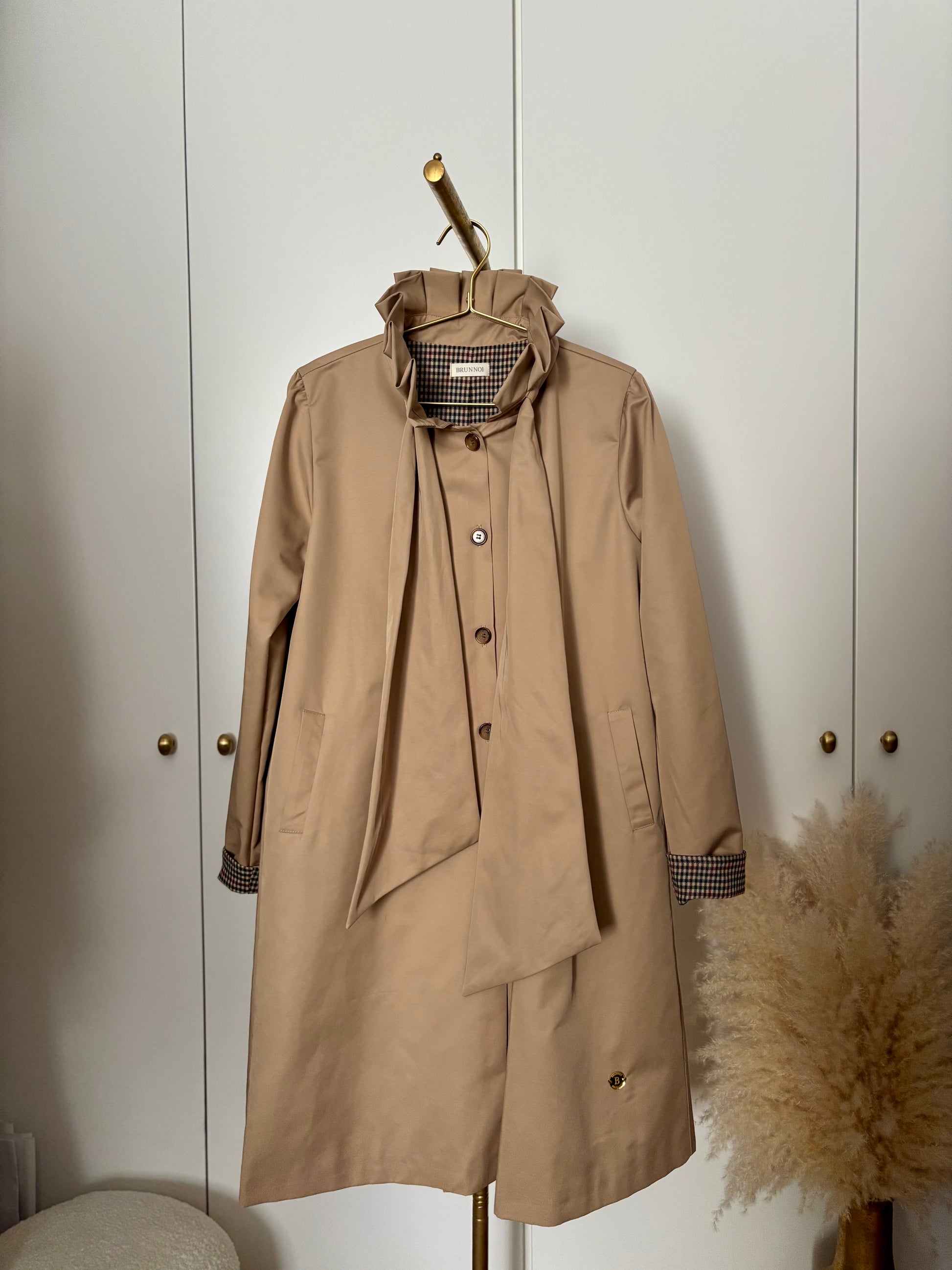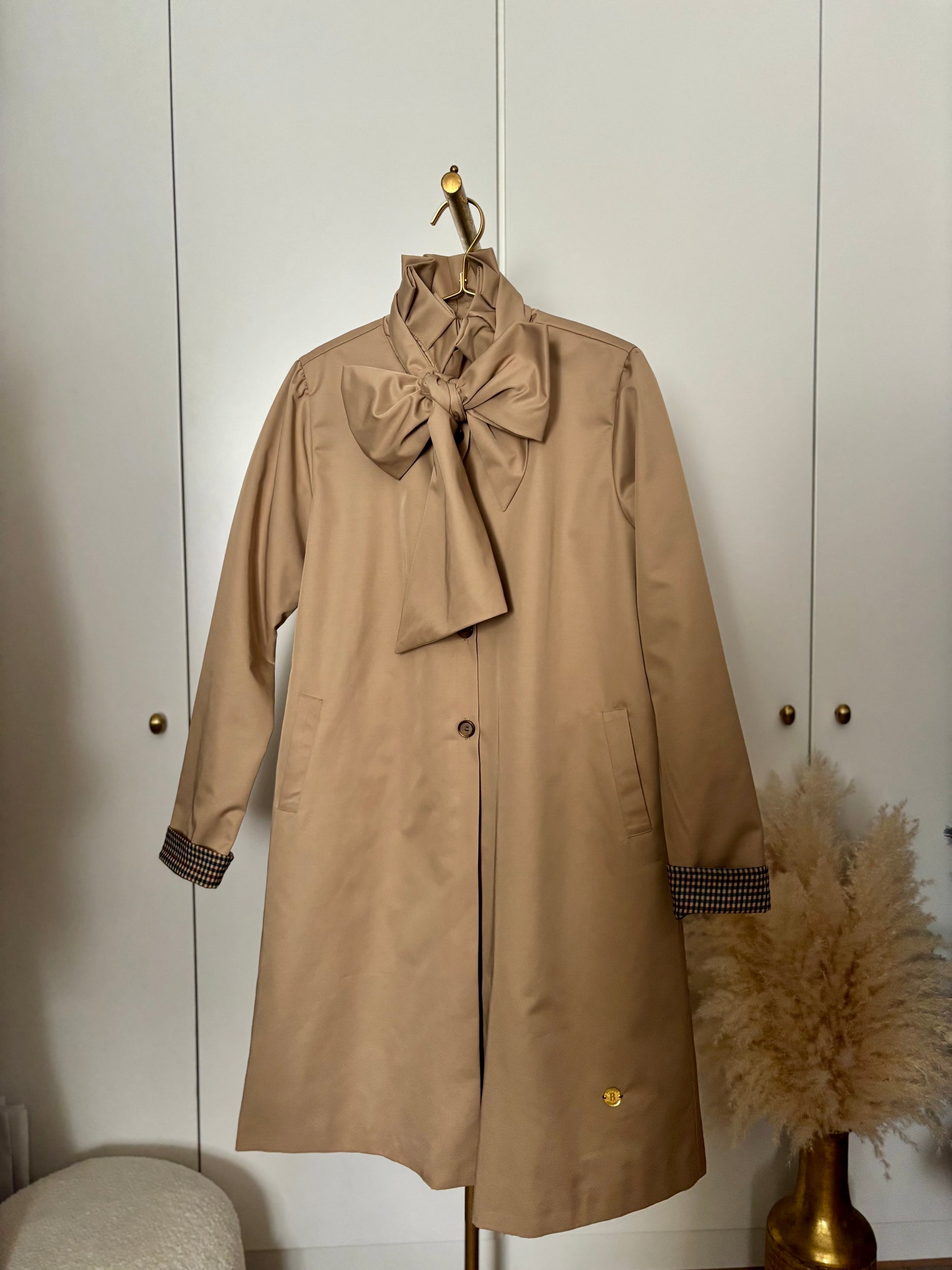 Gabardina en 3/4 abotonada, cuello plisado y gran lazada de quita y pon.
