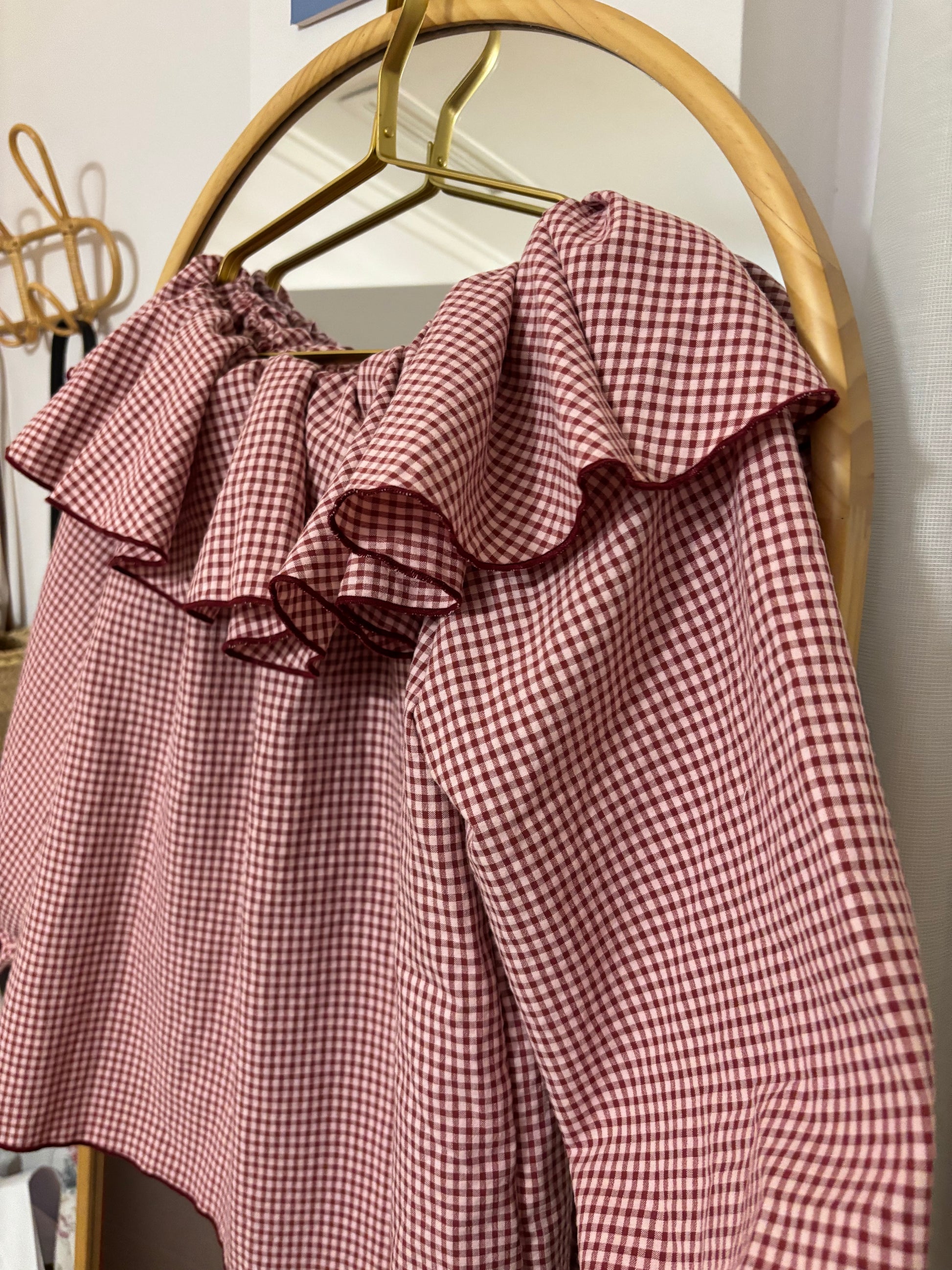 Blusa en tejido vichy seeesucker, volante en escote multi posición..